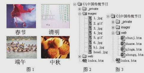 (3分)几位同学对中国传统节日进行研究,通过网上查找相关资料,制作了一个主题为“中国传统节日”的网站,主页效果(部分截图)如图1所示,网站部分素材如图2所示,网站结构如图3所示。