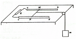 22.如图所示,相距为l 的光滑平行金属导轨ab 、cd 放置在水平桌面上,阻值为R 的电阻与导轨的两端a 、c相连。滑杆MN质量为m ,垂直于导轨并可在导轨上自由滑动,不计导轨、滑杆以及导线的电阻。整个装置放于竖直方向的范围足够大的匀强磁场中,磁感应强度的大小为B 。滑杆的中点系一不可伸长的轻绳,绳绕过固定在桌边的光滑轻滑轮后,与另一质量也为m 的物块相连,绳处于拉直状态。现将物块由静止释放,当物块达到最大速度时,物块的下落高度
