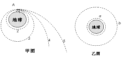 (3)如图乙所示,卫星分别沿a、b轨道做匀速圆周运动,请将运动速度5km/s、7.9km/s、11.2km/s、16.7 km/s标注在乙图中可能的轨道上