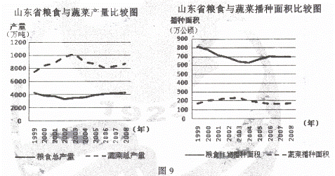材料一 据悉,近年来随国家相关文件颁布,山东农民种粮积极性日见高涨。各地一些撂芒多年的废弃地纷纷被农民抢着承包下来,同时,山东省也加强了对中低产田的改造。图9为山东省10年间粮食与蔬菜生产状况比较图。