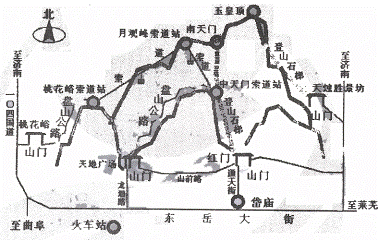 泰山是我国著名的风景名山,号称五岳之道。其旭日东升、晚霞夕照、黄河金带、云海玉盘被誉为四大奇观。图11为泰山旅游线路示意图,读图回答下列问题。