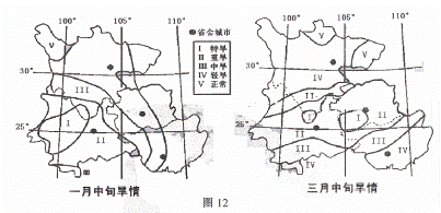 (1)读图12可知,进入2010年以来,在我国图示地区干旱范围不断扩大,重旱区逐步从云南省扩展到 省的南部、 省全部和 省西北部等。(3分)