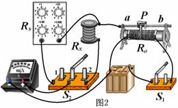 10、(12分)(1)为了测定整个过程电路产生的焦耳热,需要知道螺线管线圈的电阻。用替代法测线圈电阻Rx的阻值可用如图2所示电路,图中RS为电阻箱(RS的最大阻值大于待测电阻Rx的阻值),S2为单刀双掷开关,R0为滑动变阻器。为了电路安全,测量前应将滑动变阻器的滑片P调至___________,电阻箱RS阻值应调至___________(选填“最大”或“最小”)。闭合S1开始实验,接下来有如下一些操作,合理的次序是_____(选填字母代号):