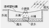 24(09黔东南州)身处偏远海岛,按图4所示方法可获取少量的淡水。阳光的照射使池内海水加快 ,形成水蒸气;