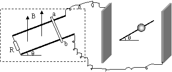 如图所示的虚线空间内分布着竖直向上的磁感应强度为B的匀强磁场。在虚线空间内有一对彼此平行的金属导轨,宽为L,与水平面的夹角为θ,导轨电阻不计。导轨的下端接一定值电阻R ,上端通过导线与一对竖直放置的平行金属板相连接,两板间距为d ,其间固定着一光滑绝缘直杆,它与水平也成θ角,杆上套一带电小球。当一电阻也为R的光滑导体棒ab沿导轨以速度V匀速下滑时,小球恰好能静止在绝缘直杆上。请指明小球的电性,并求出其比荷。
