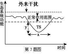 7.如图所示,两条虚线之间的部分表示生态系统功能正常的作用范围。y表示一个外来干扰使之偏离这一范围的大小;x表示恢复到原状态所需的时间;曲线与正常范围之间所夹的面积可以作为总稳定性的定量指标(TS)。下列说法正确的是