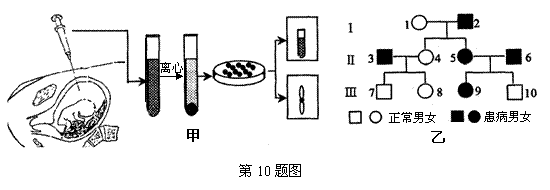 (2)某次羊水检查中发现一男性胎儿(上图乙中的III-10)表现正常,但调查却发现其姐姐(上图乙中的III-9)患有某种遗传病(用A、a表示)。请根据图乙,分析并回答下列问题: