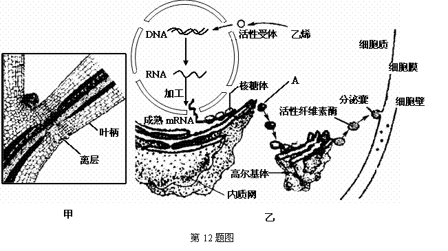 12. 秋末植物的叶片衰老时,在叶柄基部开始形成离层(如图19甲所示),随后从植物体上脱落。离层部位细胞相关的生命活动如图19乙所示。请据图回答下列问题: