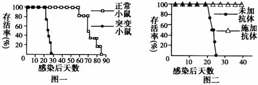 5.以某种胞内寄生的病原体去感染一种基因突变的小鼠后,比较突变小鼠与正常小鼠的死亡情况,结果如图一。感染该病原体后,进行两种小鼠体内T淋巴细胞与B淋巴细胞数目的测试,发现两种小鼠有明显差异;但是在感染前后突变小鼠血清中的免疫球蛋白浓度都非常低。如果用识别该病原体的专一性抗体处理突变小鼠后,再进行感染实验,小鼠存活的结果如图二。则下列推测合理的是