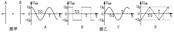 19.如图甲所示,在两平行金属板中央有一个静止的电子(不计重力),当两板间加上如图乙所示的交变电压后,电子不可能做往返运动的电压是: