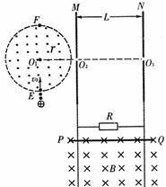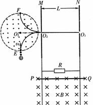 25.(18分)如图所示,半径为r、圆心为O1的虚线所围的圆形区域内存在垂直纸面向外的匀强磁场,在磁场右侧有一坚直放置的平行金属板M和N,两板间距离为L,在MN板中央各有一个小孔O2、O3、O1、O2、O3在同一水平直线上,与平行金属板相接的是两条竖直放置间距为L的足够长的光滑金属导轨,导体棒PQ与导轨接触良好,与阻值为R的电阴形成闭合回路(导轨与导体棒的电阻不计),该回路处在磁感应强度大小为B,方向垂直纸面向里的匀强磁场中,整个装置处在真空室中,有一束电荷量为+q、质量为m的粒子流(重力不计),以速率v0从圆形磁场边界上的最低点E沿半径方向射入圆形磁场区域,最后从小孔O3射出。现释放导体棒PQ,其下滑h后开始匀速运动,此后粒子恰好不能从O3射出,而从圆形磁场的最高点F射出。求:
