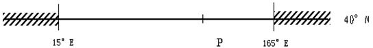 下图是某日某时刻40°N纬线的昼夜分布状况图(阴影区表示黑夜),回答11-12题。
