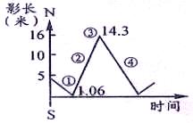 右图是某研究性学习小组绘制的本地区朝向正南的楼房(10米高),连续一年多正午影子长度变化图。读图回答13-14题。