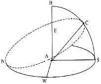 下图反映A地地平面观察到的太阳视运动过程图,其中虚线圈为太阳视运动轨迹,B为A地的天顶,C为太阳视运动某一位置。读图分析17-18题