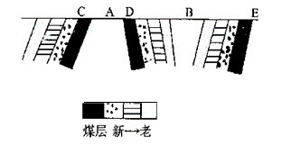 (3)若乙图中C.D.E三处均出现煤层的露头,那么,在A.B两处分别打钻井,何处地下能打到煤层? (字母)(1分),原因是 (2分)。(请在乙图上绘图说明)(2分)