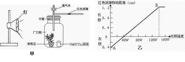 下图甲为某校生物兴趣小组探究光照强度对茉莉花光合作用强度影响的实验装置示意图,图乙为每小时所测得的结果。据图分析: