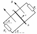 如图所示,平行金属导轨与水平面成θ角,导轨与两相同的定值电阻R1和R2相连,匀强磁场垂直穿过导轨平面。有一导体棒ab质量为m,棒的电阻R=0.5R1,棒与导轨之间的动摩擦因数为μ。导体棒ab沿导轨向上滑动,当上滑的速度为v时,定值电阻R2消耗的电功率为P,此时下列正确的是