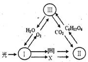 右图为绿色植物体内某些代谢过程中物质变化的示意图,I、II、III分别表示不同代谢过程。以下叙述不正确的是(