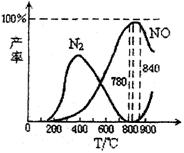 主反应①和副反应②,有关物质产率与温度的关系如右图。
