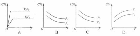 如图2所示,反应3A(g)+B(g) 2C(g)△H<0,随不同温度(T1>T2)。不同压强(P2>P2)或不同时间(t),混合气中C的体积分数C%变化的曲线中,下列图像错误的是( )