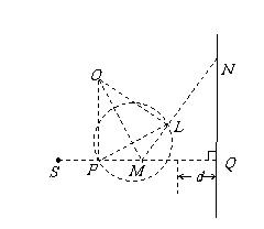 设从L点射出磁场的粒子能打在屏上的N点,LN的反向延长线交PQ于M点,由对称性可知:![]()