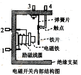 ②在有些应用电磁开关的场合,为了安全,往往需要在电磁铁吸合铁片时,接线柱3、4之间从断开变为接通。为此,电磁开关内部结构应如何改造?请结合本题中电磁开关内部结构图说明。