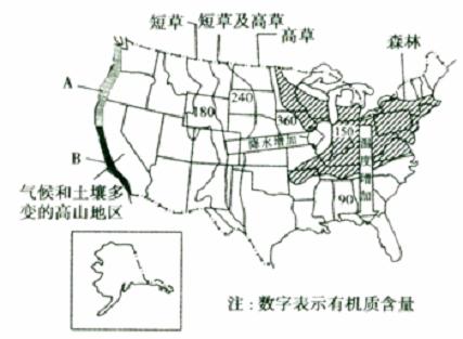 (2)分析美国大陆中部、东部土壤中有机质含量多少的分布规律,并分析其成因。(12分)