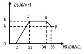 ⑵在DE段,沉淀的物质的量没有变化,则此阶段发生反应的离子方程式为 ;上述现象说明溶液中___ _结合OH-的能力比 强(填离子符号)。
