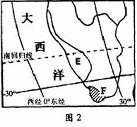 图中E为一热带沙摸区,它沿大西洋海岸延伸2100千米,该沙漠最宽处达160千米,而最狭处只有10千米,其沿海岸线延伸的主要原因是