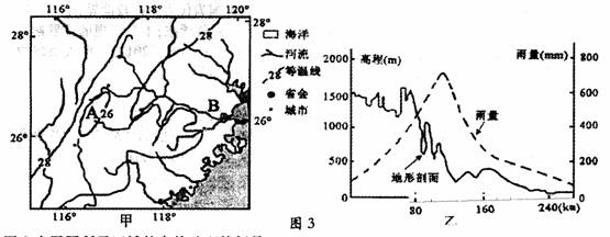 6.乙图大致为甲图中从A至B一线附近的地形剖面图,图中虚线表示当地一次特大暴雨量分布状况,据图判断最大暴雨量分布地区海拔高度约为多少米?
