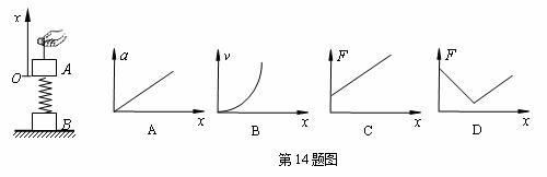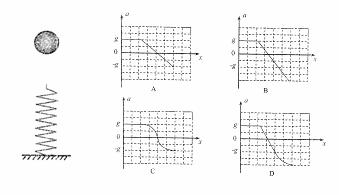 5.(北京市崇文区2009-2010学年度第二学期统一练习(二)) 如图所示,一轻质弹簧竖直立在水平地面上,弹簧一端固定在地面上。一小球从高处自由下落到弹簧上端,将弹簧压缩至最低点。在小球开始下落至最低点的过程中,弹簧始终处于弹性限度内。在此过程中,能正确表示小球的加速度a随下降位移x的大小变化关系是下面图像中的( )