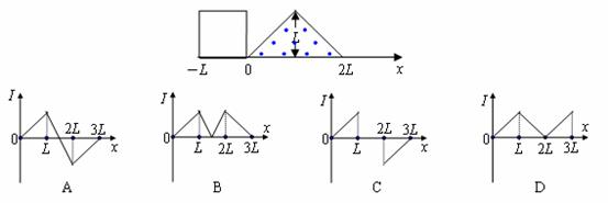 20.(2010年全国大联考(大纲)高考预测试卷) 如图所示,等腰三角形内分布有垂直于纸面向外的匀强磁场,它的底边在x轴上且长为2L,高为L。纸面内一边长为L的正方形导线框沿x轴正方向做匀速直线运动穿过匀强磁场区域,在t=0时刻恰好位于图中所示的位置。以顺时针方向为导线框中电流的正方向,在下面四幅图中能够正确表示电流--位移(I-x)关系的是 ( )