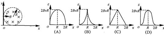 5、如图所示,平行于y轴的导体棒(此时导体棒与y轴重合)以速度v向右做匀速直线运动,经过半径为R、磁感应强度为B的圆形匀强磁场区域,导体棒中的感应电动势ε与导体棒位置x关系的图像是( )