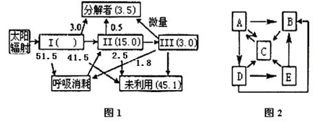 30.(12分)下图1是某生态系统能量流动的定量分析图解(I、II、III代表三个营养级,能量单位为百万千焦);图2是该生态系统相关内容模式图。请据图回答: