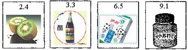23、图示上方的数值是该食物或药品的近似pH,呈碱性的是…………………………………………..( )。