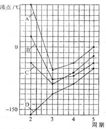 (8分)下图中A、B、C、D四条曲线分别表示ⅣA、ⅤA、ⅥA、ⅦA族元素的气态氢化物的沸点,其中表示ⅥA族元素的气态氢化物沸点的是曲线