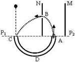 (18分)如图所示,P1P2为一水平面,其上方紧贴放置一对竖直正对的带电金属板M、N,其下方紧贴放置一内壁光滑的半圆形绝缘轨道ADC,绝缘轨道ADC位于竖直平面内,右端A恰在两板的正中央处,N板上开有小孔B,孔B到水平面P1P2的距离为绝缘轨道直径的2/3倍。设仅在M、N两板之间存在匀强电场。现在左端C的正上方某一位置,将一质量为m、电荷量为q的小球由静止释放,经过绝缘轨道CDA后从A端竖直向上射入两板间,小球能从B孔水平射出,并恰好落到C端。整个过程中,小球的电荷量不变,孔B的大小及小球直径均可忽略,重力加速度为g。求: