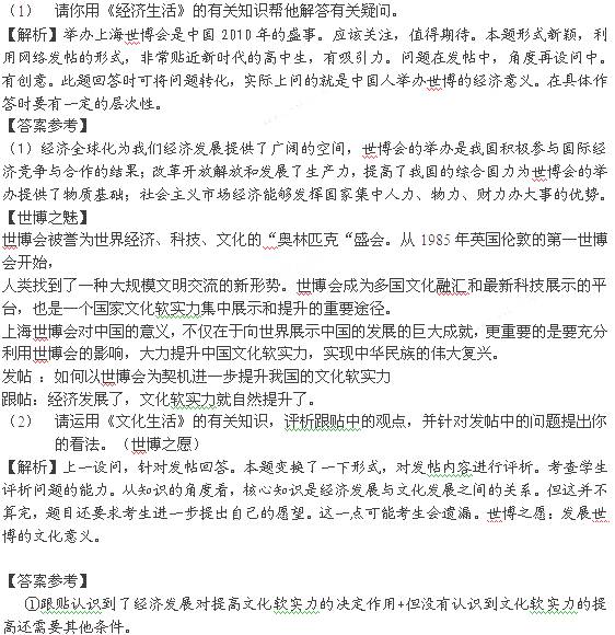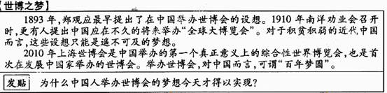 37. 2010年上海世博会的举办引起了校园世博热,同学们纷纷上网“逛”世博。一个世博专题网页引发了某同学的兴趣和思考,他发帖提出了自己的问题。以下是该网页的部分内容