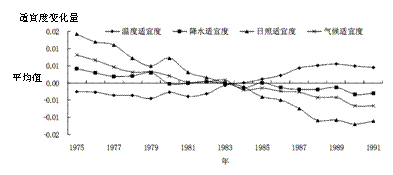 B.各气候要素的适宜度不断下降,生产风险增加