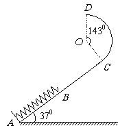 如图所示,在倾角为370的斜面上,一劲度系数k=100N/m的轻弹簧一端固定在A点,自然状态时另一端位于B点。斜面上方有一半径R=0.2m、圆心角等于143°的竖直圆弧形光滑轨道与斜面相切于C处,圆弧轨道的最高点为D。斜面AB段光滑,BC段粗糙且长度为0.4m。现将一质量为1kg的小物块从C点由静止释放,小物块将弹簧压缩了0.2m后速度减为零(不计小物块到达B处与弹簧碰撞时的能量损失)。已知弹簧弹性势能表达式Ek=