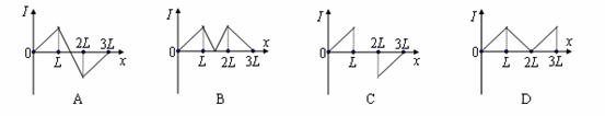 如图所示,等腰三角形内分布有垂直于纸面向外的匀强磁场,它的底边在x轴上且长为2L,高为L。纸面内一边长为L的正方形导线框沿x轴正方向做匀速直线运动穿过匀强磁场区域,在t=0时刻恰好位于图中所示的位置。以顺时针方向为导线框中电流的正方向,在下面四幅图中能够k_s_5_u正确表示电流--位移(I-x)关系的是( )