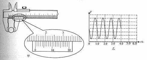 22.(8分)在做“用单摆测定重力加速度”的实验中,用主尺最小分度为1mm,游标上有20个分度的卡尺测量金属球的直径,结果如图甲所示,可以读出此金属球的直径为 mm。单摆细绳的悬点与拉力传感器相连,将摆球拉开一小角度使单摆做简谐运动后,拉力传感器记录了拉力随时间变化的情况,如图乙所示,则该单摆的周期为 s。