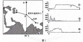 图3为以塔里木盆地某点(O)为中心向a、b、c三个方向绘制的地形剖面图。据此回答5-6题。