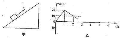 21.(19分)如图甲所示,质量为m=1kg的物体置于倾角为θ=37°的固定斜面上,对物体施加平行于斜面向上的拉力F,使物体由静止开始沿斜面向上运动。t1=1s时撤去拉力,物体运动的部分v – t图象如图乙所示。已知斜面足够长,g=10m/s2,求: