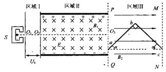 22.(20分)如图所示,粒子源S可以不断地产生质量为m、电荷量为+q的粒子。粒子从O1孔飘进(不计初速度)一水平方向的加速度电场区域I,再经小孔O2进入正交的匀强电场和匀强磁场区域II,电场强度大小为E,磁感应强度大小B1,方向如图。两平行虚线PQ、MN之间存在着水平向右的匀强磁场区域III,磁场应强度大小为B2。当在O1、O2间加上适当的电压U1时,粒子能沿图中虚线O2O3垂直于PQ进入区域III,并从MN边飞出。现将一块不带电的、宽度和厚度均不计的直角状硬质塑料板abc放置在区域III内,a、c两点恰分别位于PQ、MN上,ac连线与O2O3平行,ab=bc=L,α=45°,仍使粒子沿图中虚线O2O3进入区域III,发现粒子仍能从MN边飞出。粒子的重力不计。