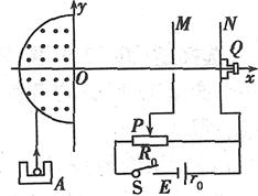 如图所示,某放射源A中均匀地向外辐射出平行于y轴的速度一定的α粒子,粒子质量为m,电荷量为q.为测定其从放射源飞出的速度大小,现让α粒子先经过一个磁感应强度为B、区域为半圆形的匀强磁场,经该磁场偏转后,它恰好能够沿x轴进入右侧的平行板电容器,并打到置于板N的荧光屏上出现亮点.当触头P从右端向左移动到滑动变阻器的中央位置时,通过显微镜头Q看到屏上的亮点恰好能消失.已知电源电动势为E,内阻为r0,滑动变阻器的总电阻R0=2 r0,求: