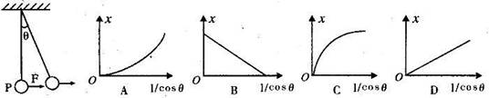 15.如图所示,一根橡皮绳上端固定在天花板上,下端系一小球P,小球处于静止状态。现对小球施加一个方向始终水平向右的外力F,使小球缓慢向右偏移。已知橡皮绳中的弹力与其伸长量成正比,移动中橡皮绳与竖直方向的夹角θ< 90°,且橡皮绳的伸长量不超过弹性限度,则下面给出的橡皮绳伸长量x 与1/cosθ的函数关系图象中,正确的是( )