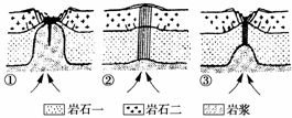 地壳变薄,岩浆上升明显;①表示岩层断裂,岩浆上升冷却凝固形成岩浆岩。第9题,