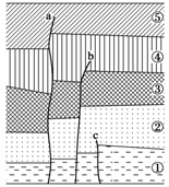 成的①②两地层发生断裂错位,故c断层发生于①②两层地层形成之后;其后发生了b