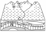 (3)试在右图中绘出丙处地下岩层和地貌的形成演变过程并加以说明。